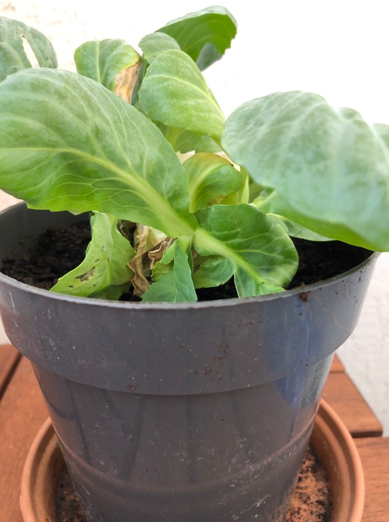 ミニトマトちゃんにまじって、リンゴちゃんも写っているが、このリンゴちゃんも美味しくいただいた後で種を植えて出てきた子である。そしてこちらがキャベツ君↓。これまた美味しくいただいた後のキャベツの芯から再生した子である!まあ、キャベツ君は葉が巻いて玉には恐らくならないだろうから、観賞用ということで。