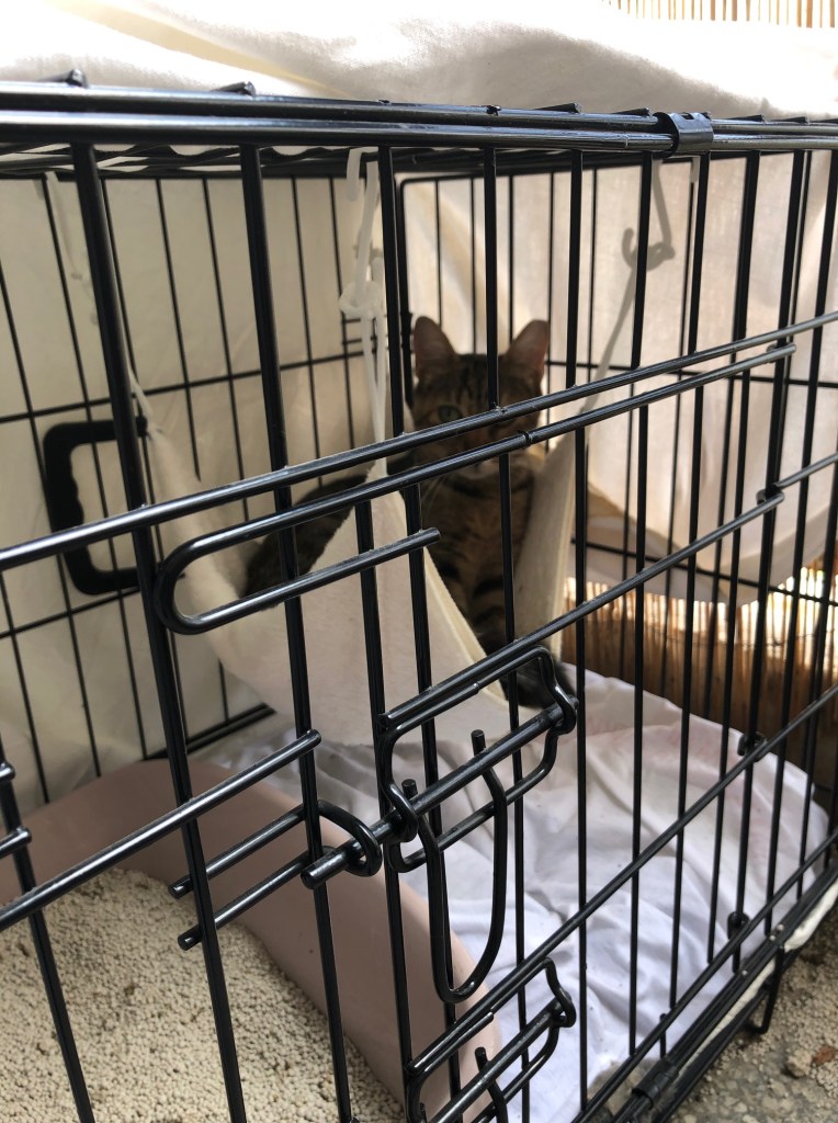キャリーに入ったものの、それからパニックモードになってしまった小春ちゃん。ケージになんとか移動できたものの、ケージの隅で固まってしまった。私のことを見るその目は確かに「裏切者ニャ」と言っていた。美味しいご飯を用意して、食いしん坊の小春ちゃんのことだから、ご飯をモグモグ食べたら機嫌を直してくれるだろうと期待を寄せたが、答えは残念ながらNOだった。いつもの他猫(たにん)のご飯まで横取りして食べるくらいの勢いは皆無であり、私から「裏切者」を見つめる視線をそらす気配はない。