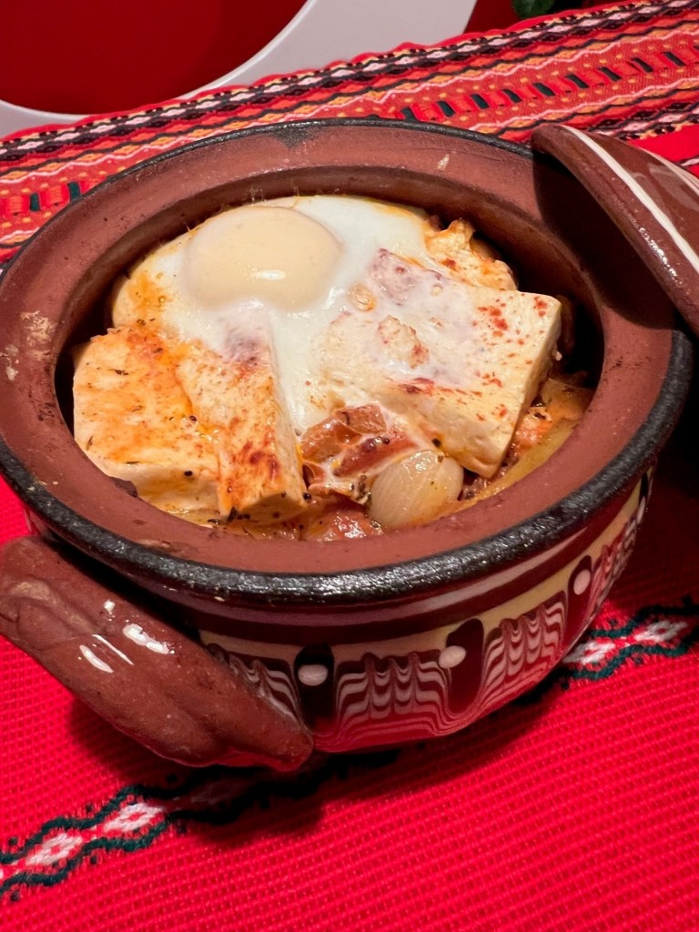 3)野菜と肉に火が通って少しは野菜も柔らかくなったら、それを陶器に移し入れて水をすこーしだけ入れる。野菜たちの上にシレネー(白チーズ)を乗せ、オリーブオイルを回し入れ、もう一回心持ちパプリカパウダーをパラパラっとして蓋をする。あ、そうそうニンニクも一片ぽーんと入れる。