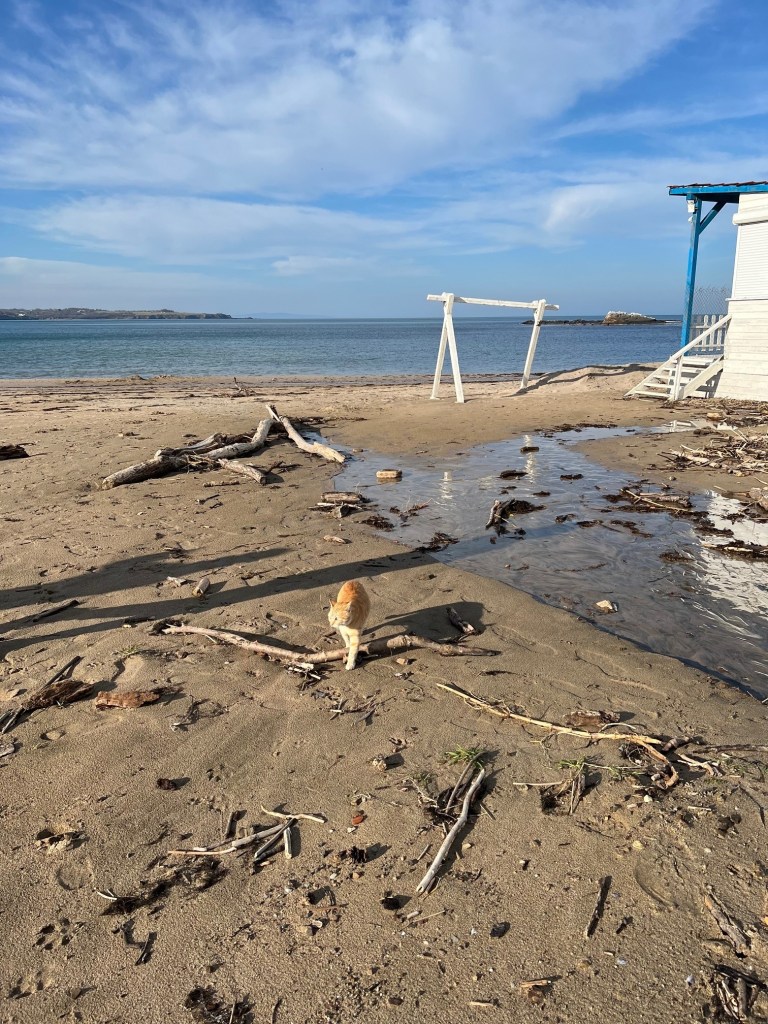 ヌイちゃんは以前にも一度私と息子の後を、ビーチまで付いて来たことがあったが、今回もポカポカする日差しの中を、私達の後を付いてやって来た。野良友ヌイちゃんとワクワクのお散歩である!